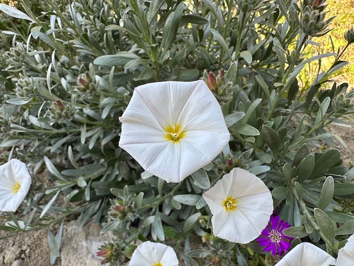 An easy plant that is supposed to want nothing but sunshine and well-drained soil and to not need a drop of water, once established. It tolerates salty air but is less hardy (up to -7°C in dry soil) than other convolvulus.