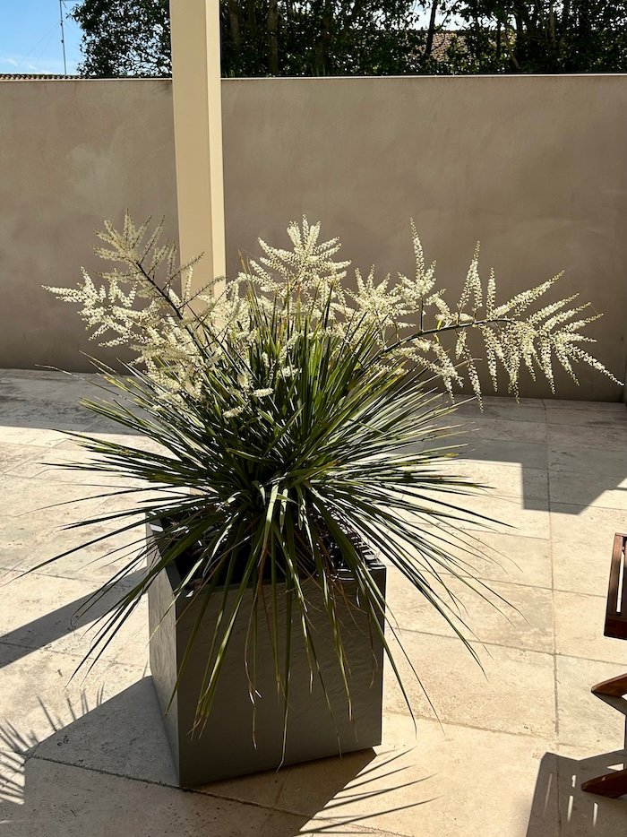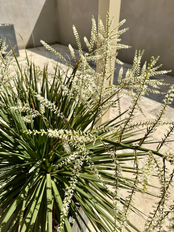 In the spring of 2025 the plant looked great. It grew two new trunks and then, in March, several stalks that flowered throughout May with wonderful white, jasmine-scented flowers. They stayed on the plant forever, albeit getting darker and losing their scent. I finally cut off the flower stalks in June to clean out the masses of spider webs among the leaves. In the summer the plant began to look tired and burned. I put it in the shade but it continued to dry up, despite watering, and in September it looked mostly dead. In November it grew a new green trunk in the middle of all the dry stuff, but was impossible to separate or clean up. I tried pulling off the new trunk and putting it in water to see if it would grow roots, but that didn’t work out. So the whole plant went on the compost.