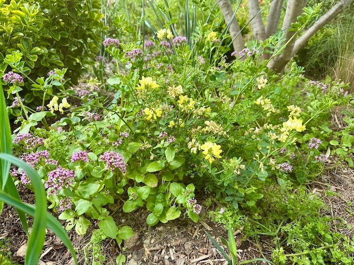 This subspecies of Coronilla valentina has pale yellow, scented flowers from January through April. It is a small (about 100x100cm), evergreen Mediterranean shrub, at home in brushy, dry habitats such as the garrigue. It needs well-drained soil and can take half-shade. It is hardy to -15℃ but likes warm and sheltered conditions. I’ve planted it in October 2024 under the large olive tree and so far it’s done well, although it did look a bit thin over the summer. Coronilla valentina is somewhat drought-resistant with a Filippi code de secheresse of 3.5.