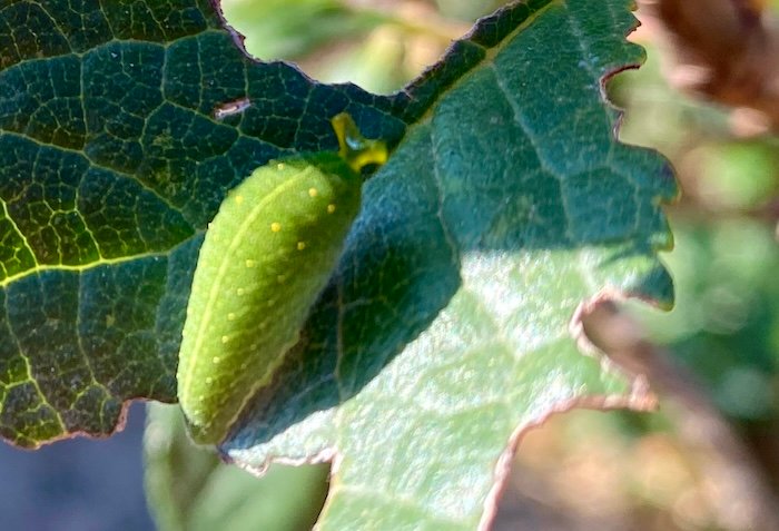 Great Tiger Moths resting in the garden during the daytime, white butterflies and the occasional Swallowtails dancing from flower to flower, and even a beautiful yellow and orange Cleopatra Butterfly. This fall I planted a buckthorn (Rhamnus alaternus) shrub, because that’s the only plant their caterpillars can feed on. There was also the strange caterpillar of an Iphiclides podalirius on a plum tree leaf – it puts up little horns when it feels threatened. Unfortunately I never saw the adult butterfly.