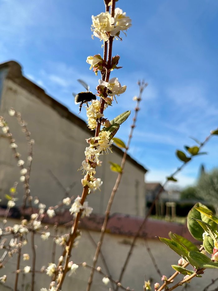Between the stonewalled vegetable beds is a very old and very robust Lonicera purpusii or fragrantissima. Its creamy white, honeysuckle-scented flowers on naked stems are an early feast for bees from February through April. For one reason or another we’ve chopped it back severely several times and each time it comes back even bigger and stronger.
