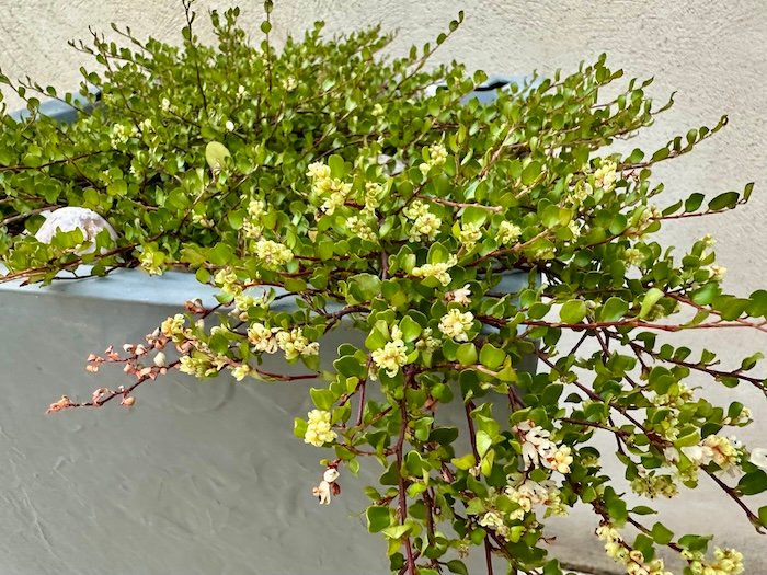 Both are natives from New Zealand. They are hardy down to -9 ℃ and don’t particularly care what soil they grow in, the leaves are semi-persistent. Muehlenbeckia can be invasive and overrun other plants in milder climates, here in this Mediterranean garden the heat and drought seem to keep it well in check.