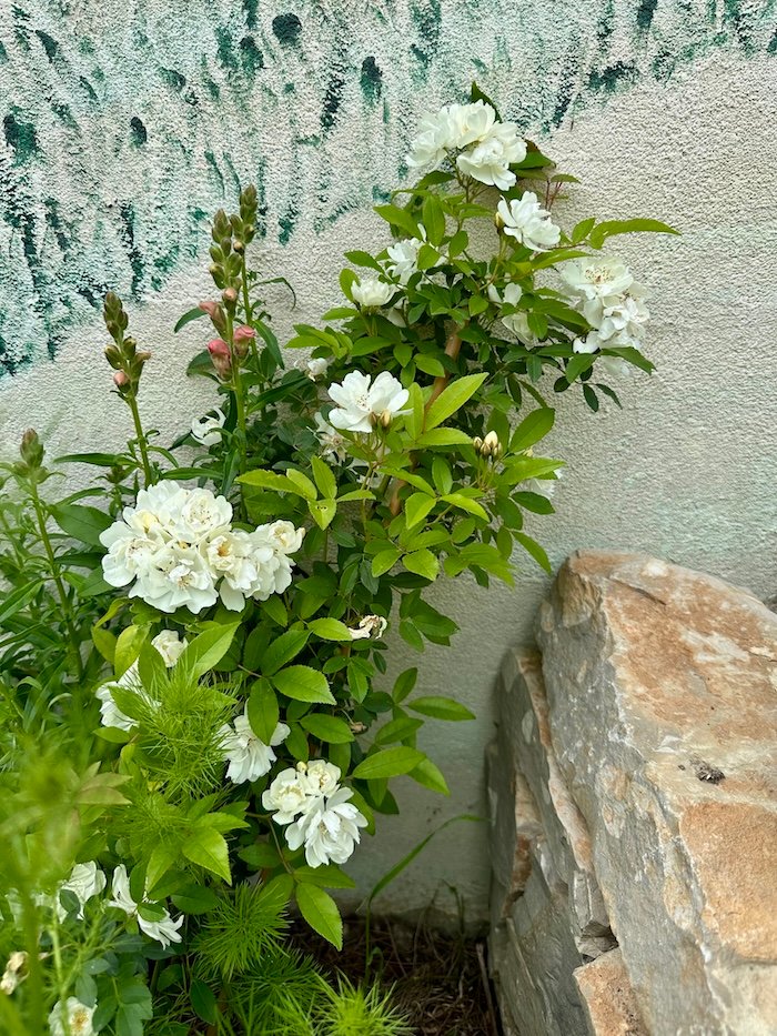 Another rose I found in 2023 while looking for more robust varieties. It is even mentioned by Olivier Filippi as a drought resistant rose with a “code sécheresse” of 3. I planted it in November 2023 in full sun. It has flowered between April and May but it hasn’t grown much at all in the past two years and seemed to suffer in this spot. In the fall of 2025 I moved into the new “zone 3” and will see if that helps. The flowers have a lovely perfume, last a long time and seem to tolerate the sun quite well.