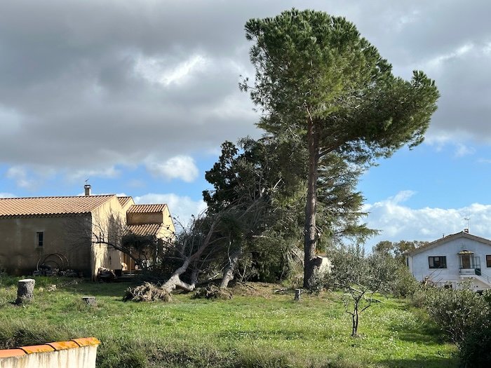 We’ve had horrendous wildfires last summer where 17’000 hectares (42’000 acres) of pine forests burned up within a few days. Then, this winter, we’ve had endless rain with widespread flooding and finally, last week, a windstorm with gusts of up to 160 km/h over several hours. Seeing the violence of the fires and seeing all those uprooted parasol pines these last few days, I kept thinking: Maybe (re-)planting pines down here is not the best of ideas.